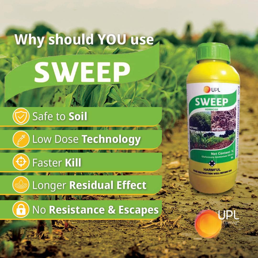 Sweep Herbicide is a powerful broad-spectrum herbicide designed to control a wide range of weeds, including grasses, broadleaf weeds, and stubborn invasive species. It is widely used by farmers for effective land preparation, weed management, and crop protection, helping to improve farm productivity and yield.